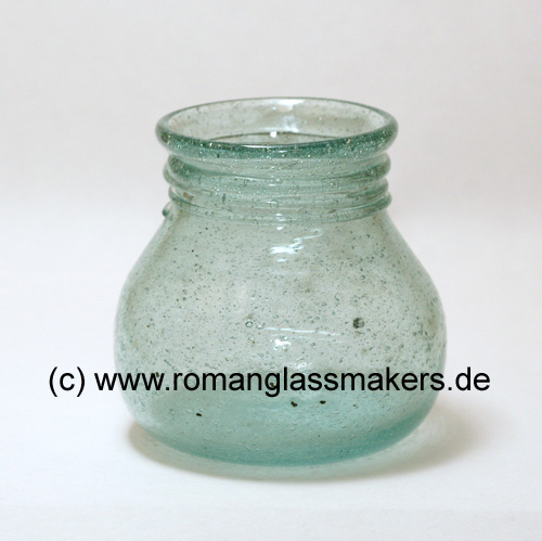 Dieses Glasgefäß ist 2018 von Frank Wiesenberg am holzbefeuerten Experimentalofen GO-Borg-2 im Archäologiepark Römische Villa Borg gefertigt worden.Aufgrund der authentischen Arbeitsbedingungen und der Ofenatmosphäre können diese Gläser im Gegensatz zu den im gasbetriebenen Studioofen gefertigten Stücken vereinzelt Einschlüsse (Holzkohle und Ofenlehm) aufweisen. Aufgrund der kurzen Schmelz- und Läuterungszeit in diesem Experimentalofen sind sie wesentlich blasenreicher als die im Studio gefertigten Stücke.